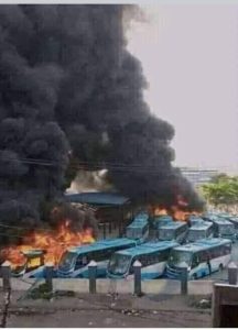•Scene of BRT buses set ablaze during October 20, 2020 ENDSARS protest in Lagos.