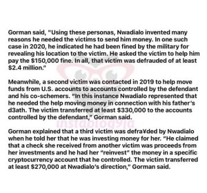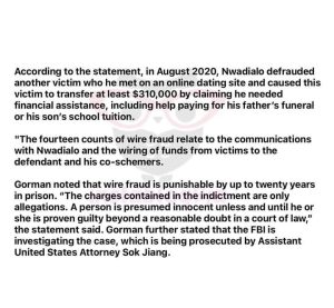 According to the indictment by the U.S. Department of Justice, Nwadialo used fake identities on popular dating platforms like Match, Zoosk, and Christian Café, to hoodwink his victims into sending millions of dollars to him.