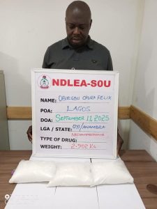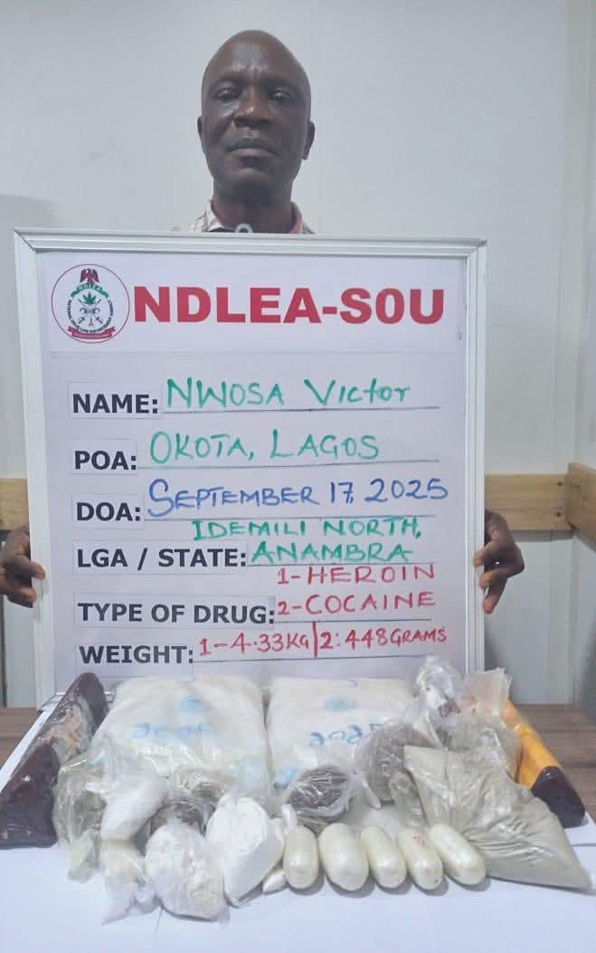 According to the agency, at the time they were preparing their consignments for export, NDLEA-SOU operatives who have for months put them under surveillance, swooped on them in different parts of Lagos. Nwosa was arrested on Wednesday 17th September 2025 at his 16 Femi Kila street, Okota home where 4.33 kilograms of heroin and 448 grams of cocaine were recovered during a search of his house.