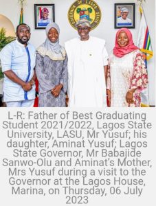 Governor Babajide Sanwo-Olu has hosted a valediction for Miss. Yusuf Aminat Imoitesemeh — the Lagos State University’s best student of all time, in the State House, Marina.