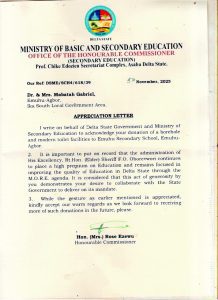 The Letter dated November 5, 2025 which was signed by Hon. (Mrs.) Rose Ezewu (Honourable Commissioner) also affirmed the commitment of Governor Oborevwori’s administration to placing high premium on education and improving its quality in Delta State.