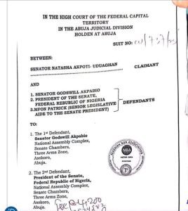 Natasha is seeking a declaration that the statements made by Akpabio and his aide are defamatory and intended to cause public opprobrium.