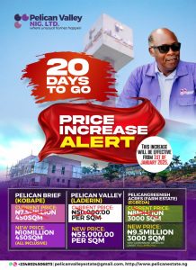 ABEOKUTA: Pelican Valley, Nigerian top – notch real estate firm behind the Pelican Valley Estate Laderin (where unusual home happens) as well as Pelican Brief, Pelican Ecostay Apartments and Pelican Greenish Acre Farm Estate situating at Abeokuta – Kobape corridor of Ogun State, has reviewed the prices of all its categories of lands upward.
